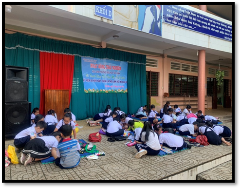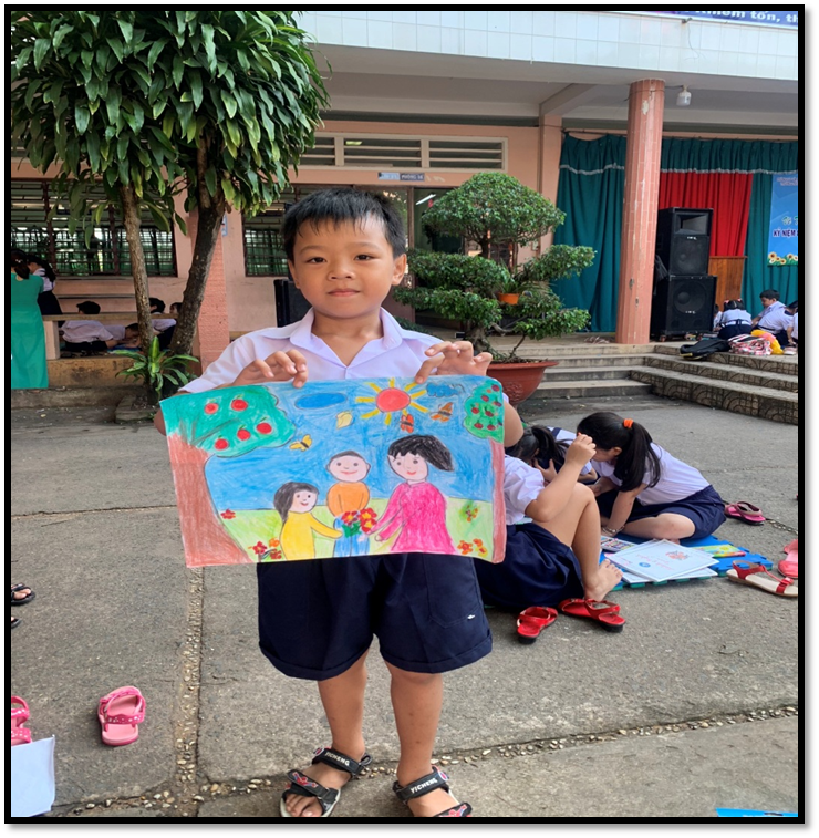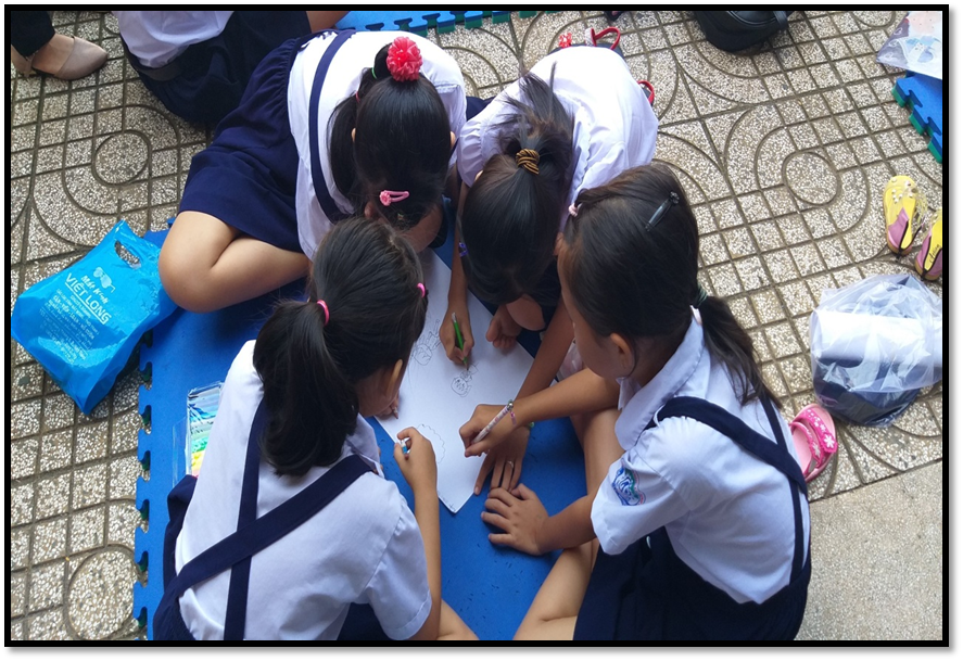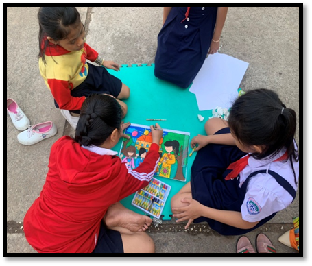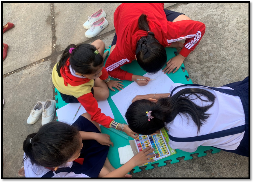 Mỗi lớp gồm 4 em cùng vẽ 1 bức tranh theo chủ đề, phân theo từng khu vực cho từng khối lớp. Đây là một hoạt động hết sức ý nghĩa, góp phần không nhỏ động viên các em phấn đấu  trong học tập đồng thời phát huy tính sáng tạo của các em, hoạt động cũng giúp các em biết đoàn kết, biết phân nhiệm vụ cùng nhau hoàn thành sản phẩm.