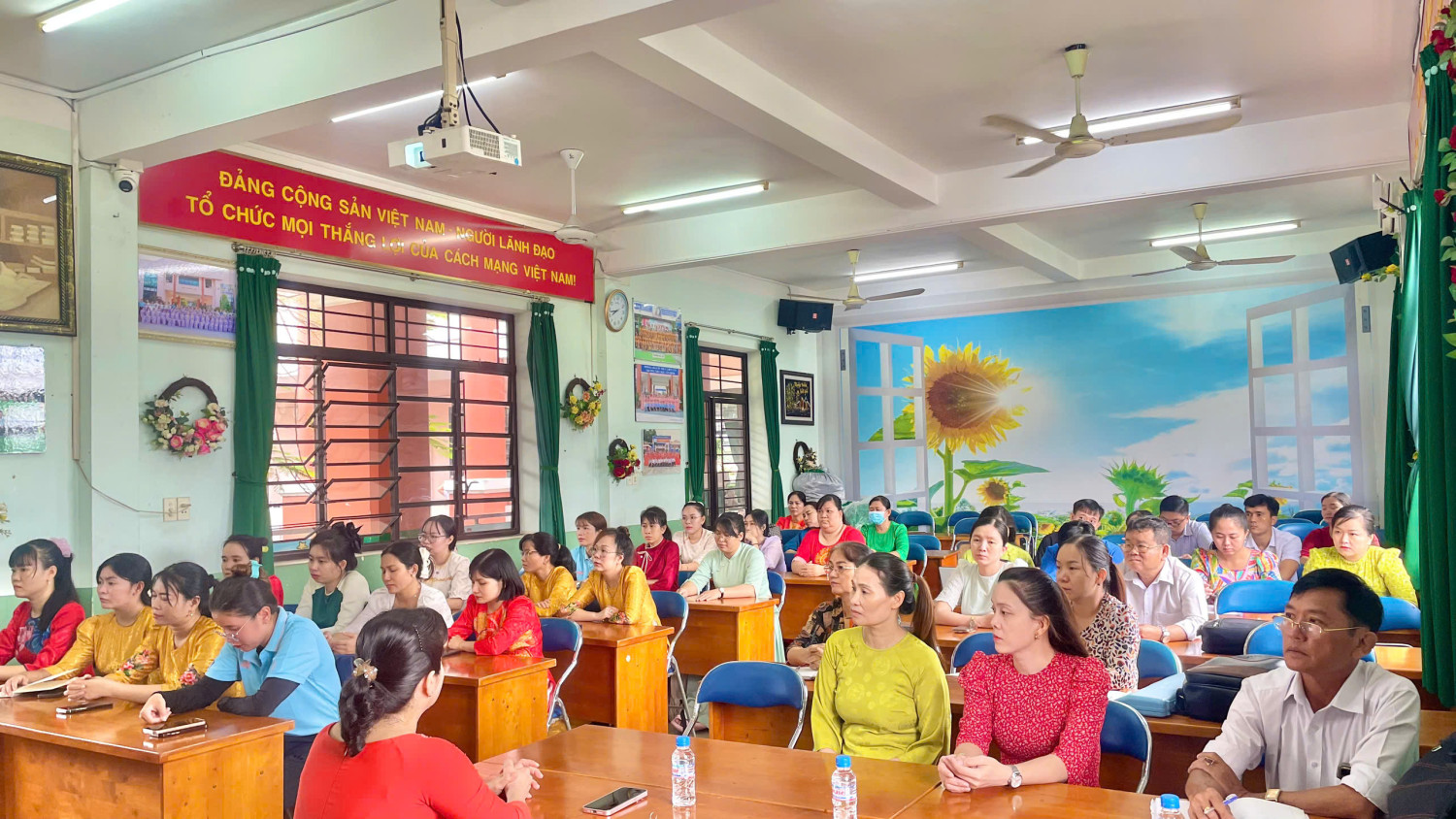 Giáo viên cùng lắng nghe Ban giám hiệu triển khai kế hoạch, nội dung của hội thi.