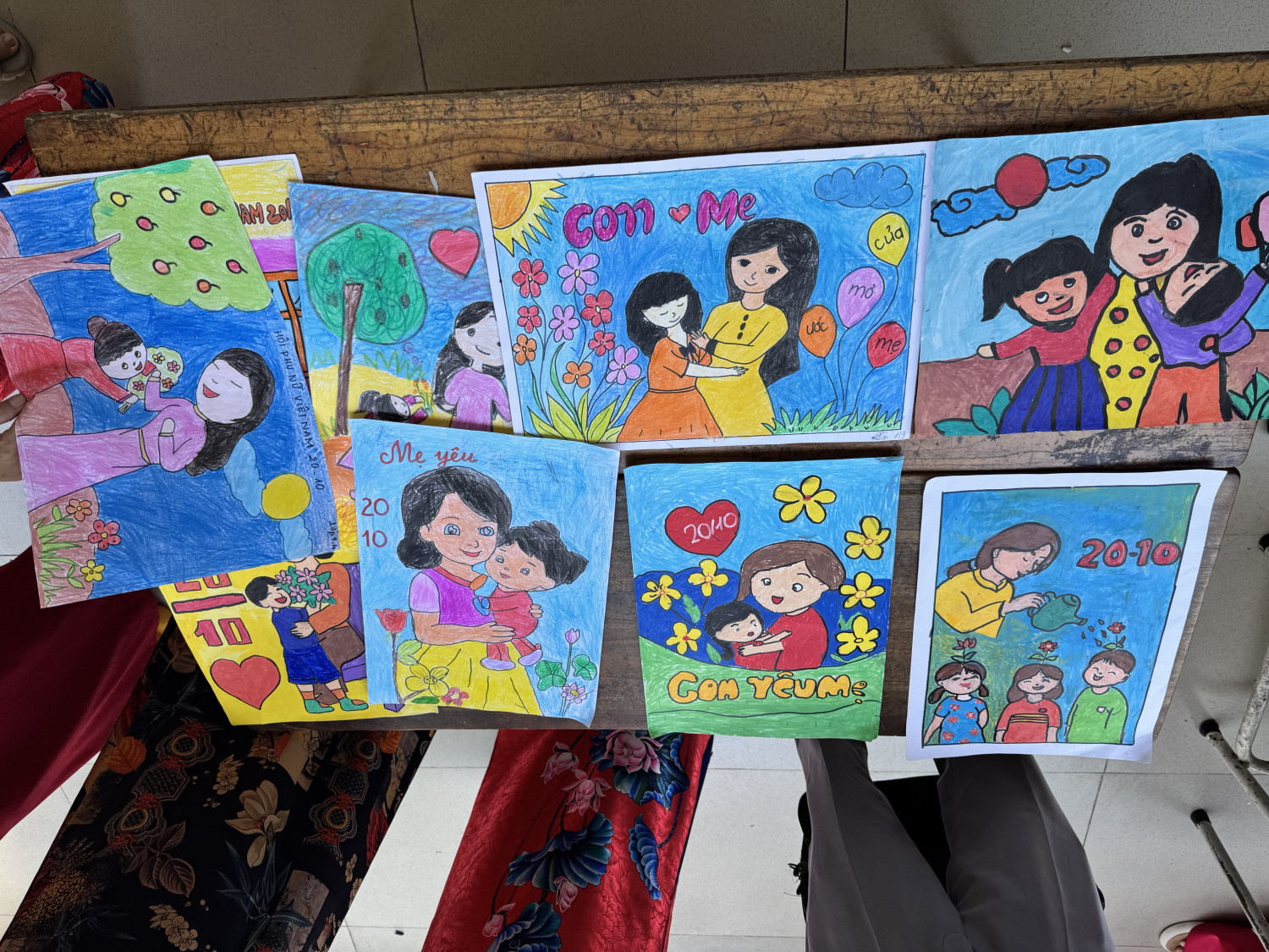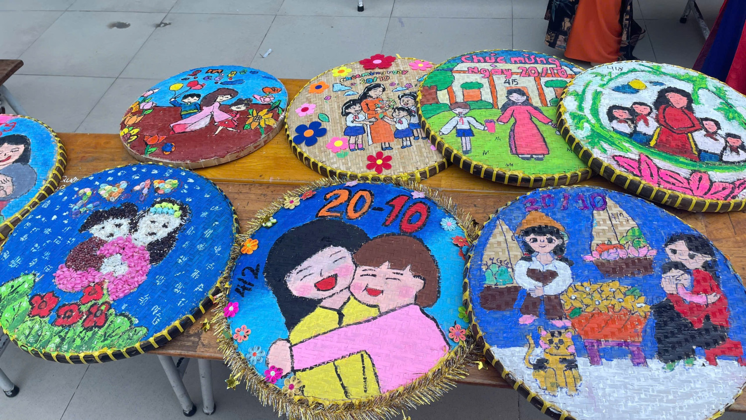 Những bức tranh và tấm mẹt tre được các em học sinh tỉ mỉ, sáng tạo, khéo léo trang trí, thể hiện tình cảm yêu thương, lòng biết ơn và sự kính trọng đối với bà, mẹ, cô giáo – những người phụ nữ thân yêu luôn dành trọn yêu thương cho gia đình và xã hội.